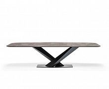 Стол с базой из стали, окрашенной в гофрированный титан (GFM11), черный (GFM73)или графитовый (GFM69) цвет. Топ из керамики под мрамор, цветов: Calacatta (KM01), Alabastro (KM02), Ardesia (KM04), матовая Golden Calacatta (KM05), глянцевая Golden Calacatta (KM06), матовая Portoro (KM07), глянцевая Portoro (KM08), глянцевая Sahara Noir (KM09) или Brown Zinc (KZ01). Топ лежит на базе без фиксации.