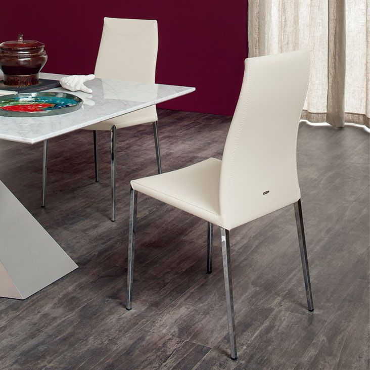 Стол со структурой из хромированной стали (08), или стали, окрашенной в матовый белый (OP71), графитовый (OP69) или гофрированный титан (GFM11). Обивка в ткани, коже или искусственной коже, микронубук или искуственный нубук цвета согласно образцам. Гибкая спинка.