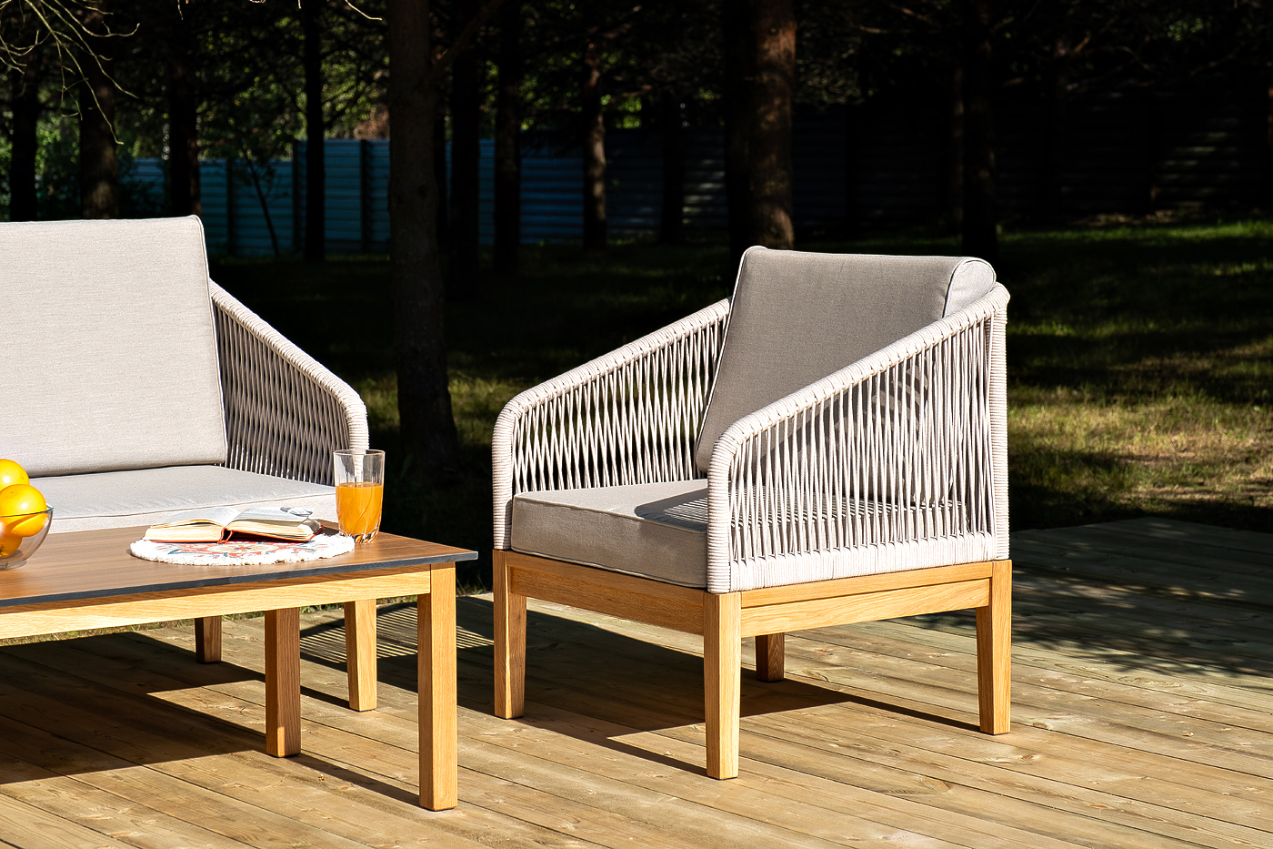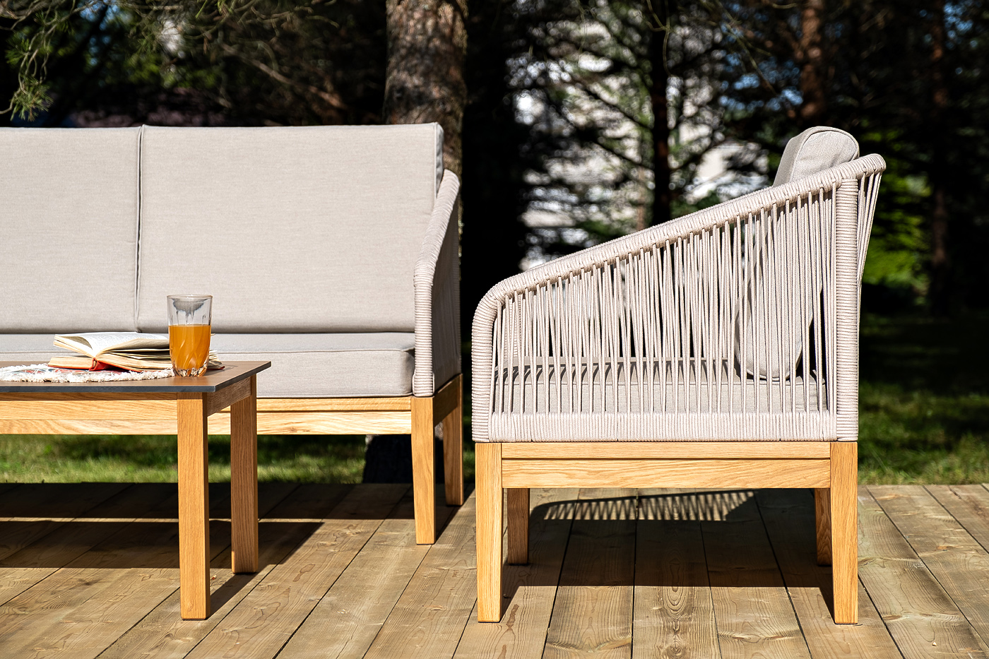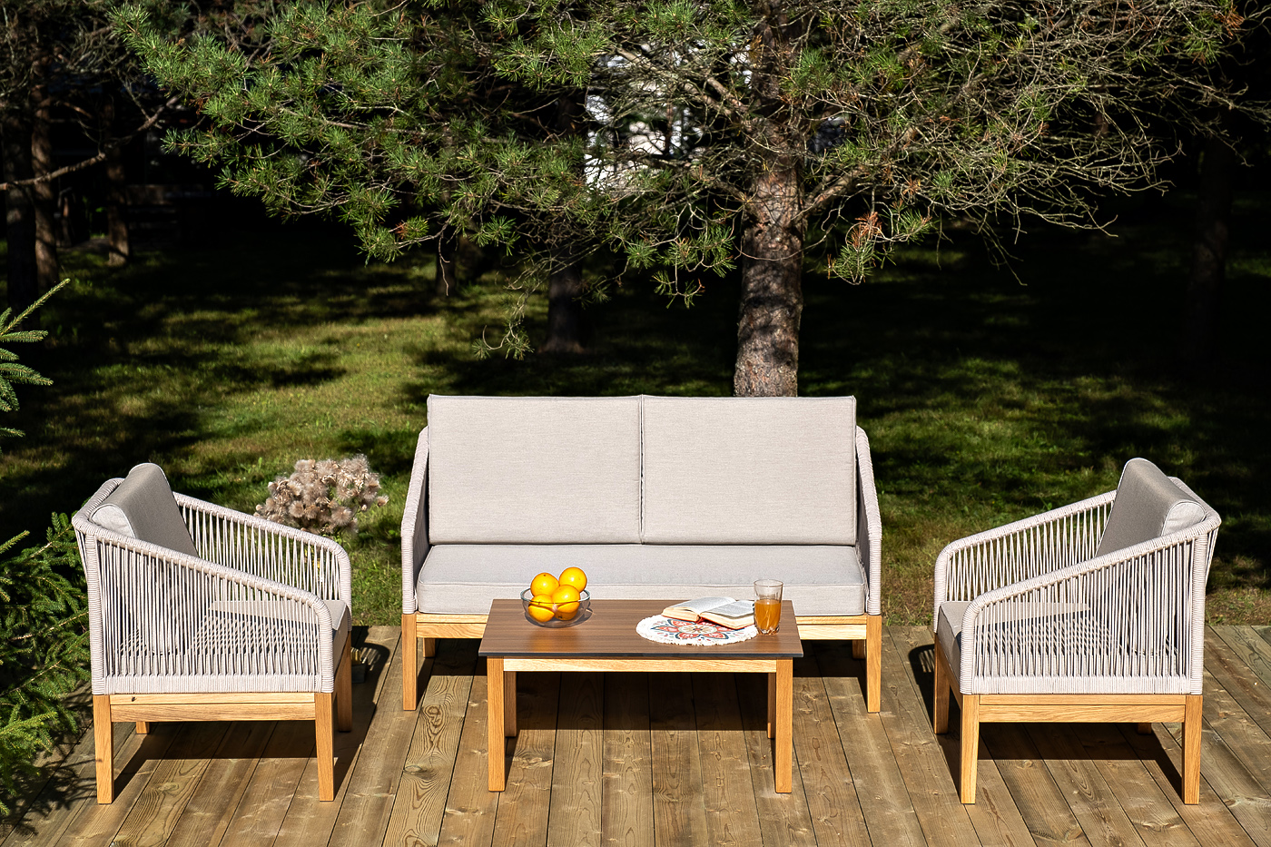 Каркас уличной мебели выполнен из дуба. Его дополняет бежевая оплетка, изготовленная на основе эластичных синтетических лент из полиэфирных волокон высокой прочности.