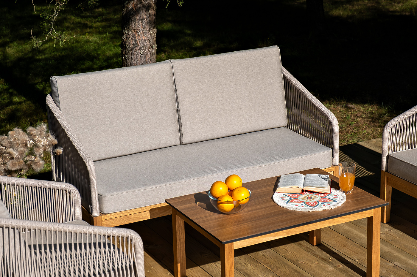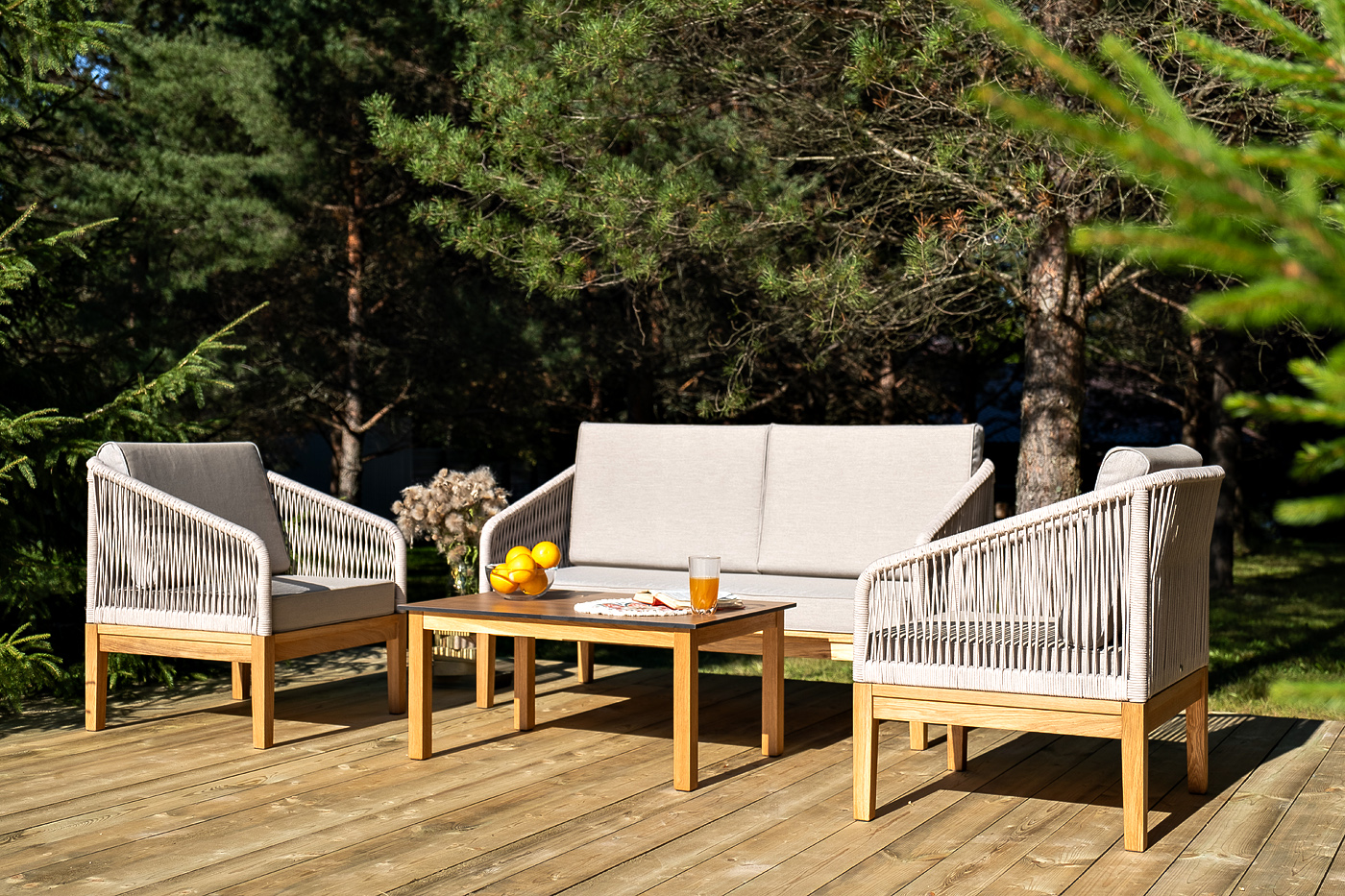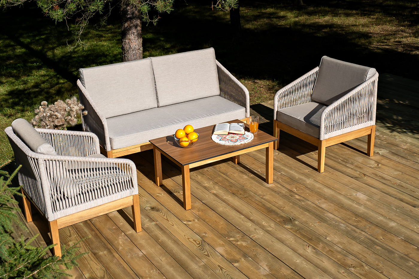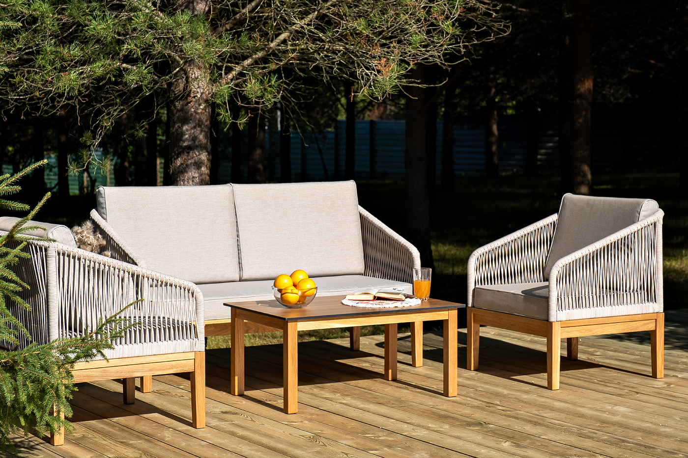 Каркас уличной мебели выполнен из дуба. Его дополняет бежевая оплетка, изготовленная на основе эластичных синтетических лент из полиэфирных волокон высокой прочности.