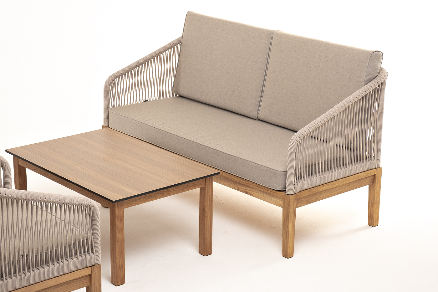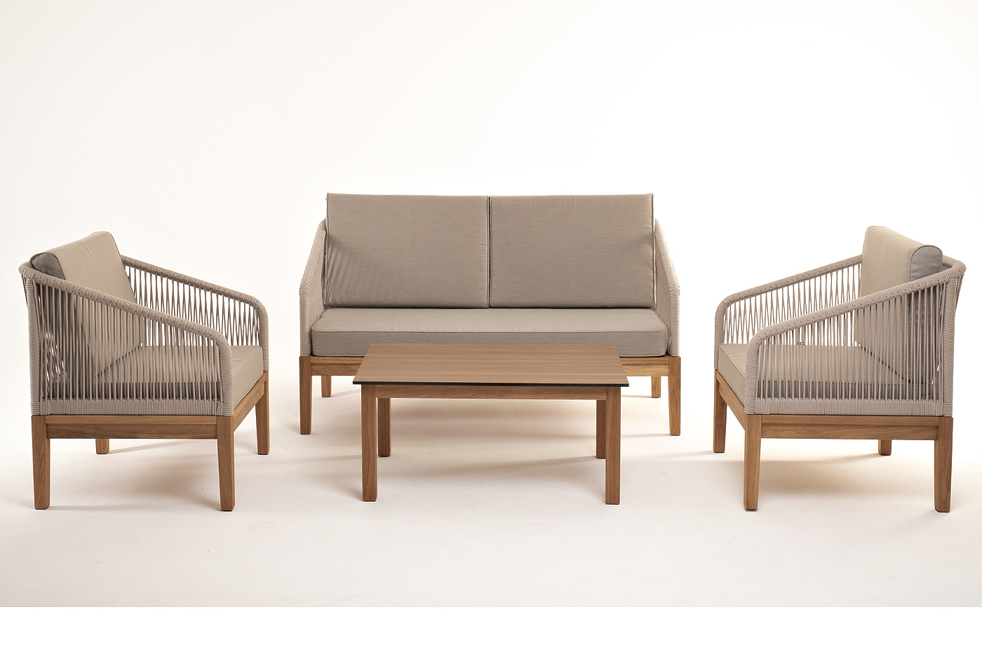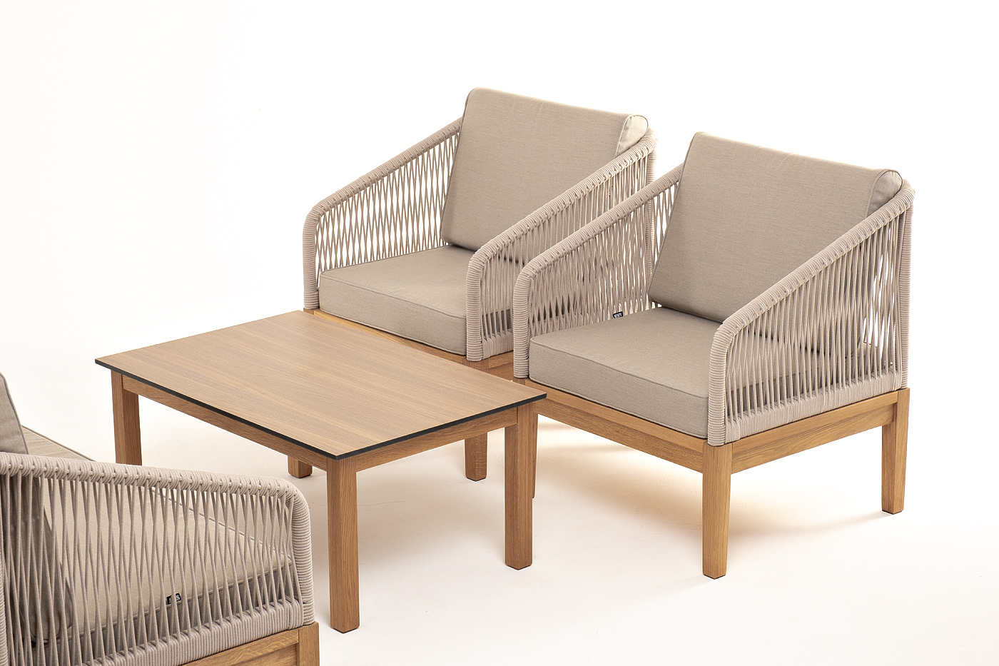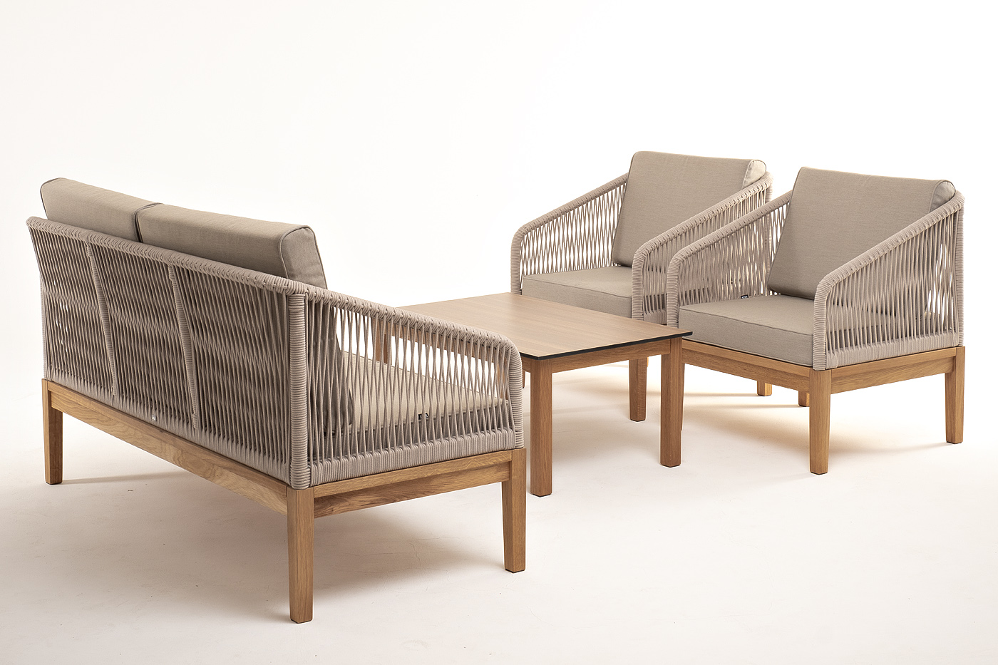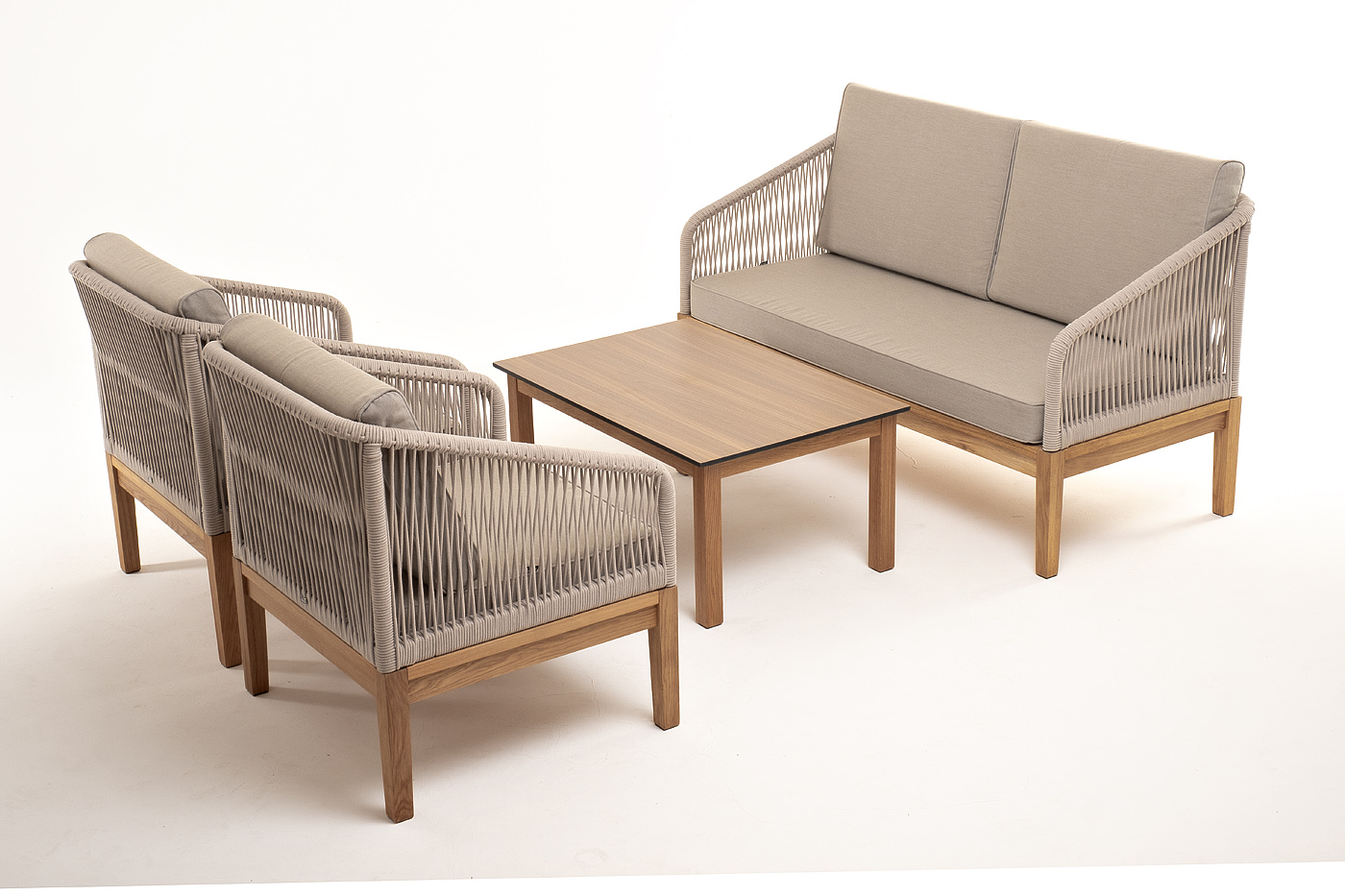 "Канны" лаунж-зона 4-местная из роупа со столиком "Канны" цвета "дуб", основание дуб, роуп бежевый