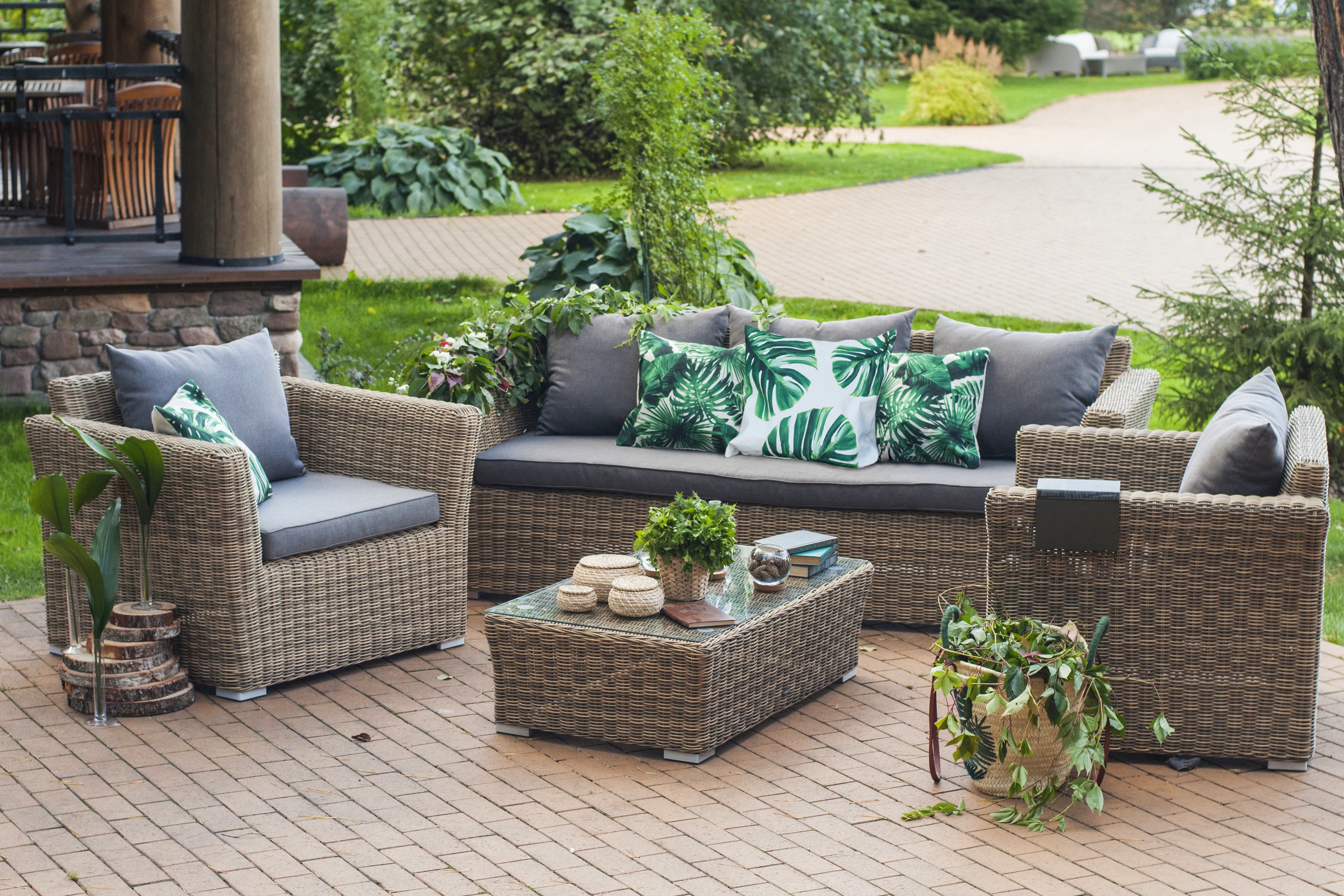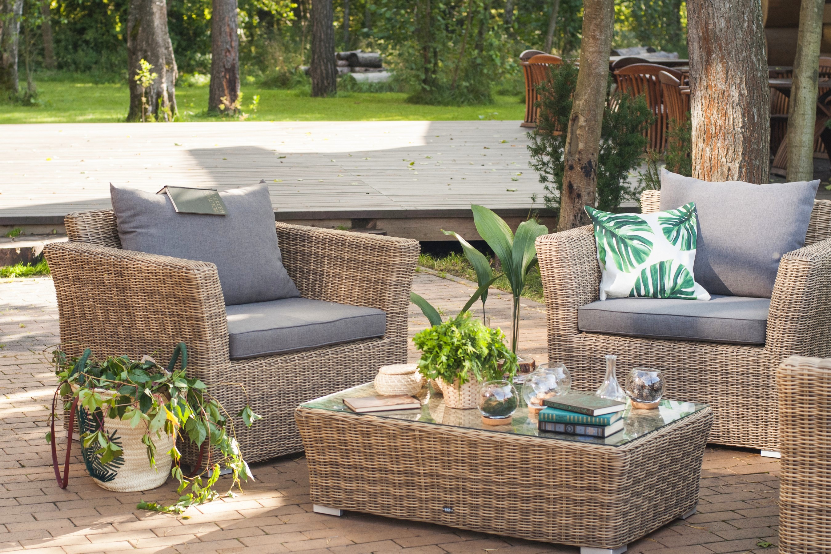Размер модели – 1100×660×340 мм. Устойчивость и прочность ей придает каркас, выполненный из высококачественного алюминия. Каркас оплетен вручную с помощью круглого искусственного ротанга. Мебель выполнена в соломенном цвете.